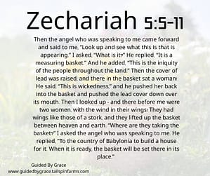 Then the angel that talked with me went forth, and said unto me, Lift up now thine eyes, and see what is this that goeth forth. 6 And I said, What is it? And he said, This is an ephah that goeth forth. He said moreover, This is their resemblance through all the earth. 7 And, behold, there was lifted up a talent of lead: and this is a woman that sitteth in the midst of the ephah. 8 And he said, This is wickedness. And he cast it into the midst of the ephah; and he cast the weight of lead upon the mouth thereof. 9 Then lifted I up mine eyes, and looked, and, behold, there came out two women, and the wind was in their wings; for they had wings like the wings of a stork: and they lifted up the ephah between the earth and the heaven. 10 Then said I to the angel that talked with me, Whither do these bear the ephah? 11 And he said unto me, To build it an house in the land of Shinar: and it shall be established, and set there upon her own base.