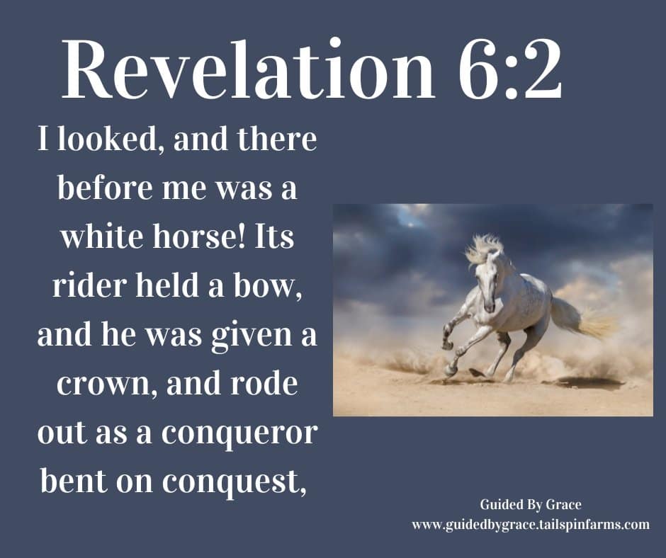 Four horsemen appear as the first four seals are opened (the imagery of the horsemen relates back to Zechariah 1:8-17; 6:1-8). representing God’s judgment on the corrupt and evil world system and the ungodly people who are part of it. The rider of the white horse is thought by many Bible interpreters to be the antichrist (1 John 2:18), the future world ruler who is to begin his activity at the beginning of the last seven years of this age. God will permit him to deceive all who oppose Christ. His initial conquest will be accomplished without open warfare since peace is taken from the earth beginning with the second horseman (Revelation 6:4; Daniel 9:26-27; 1 Thessalonians 5:3). Yet, all the other horsemen are personifications (abstract concepts described with human traits, such as “Death” as the fourth horseman), so the rider on the white horse may simply represent conquest or a strong spirit of antichrist let loose in the end time. Even so, the strong desire for conquest that has dominated every dictator in the past will certainly characterize the antichrist.