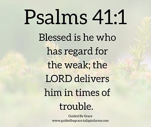 God has a special concern for the weak and helpless, and He blesses those who show love and kindness to the needy. Psalms 41:1-3 give a fuller picture of the principle found in Matthew 5:7, “Blessed are the merciful, for they will be shown mercy”. As we share God’s compassion for those in need, we can pray with confidence that God will help and rescue us when we are in trouble (Psalms 41:1), protect us from harm (Psalms 41:2), bless our lives (Psalms 41:2), destroy the power of Satan and our enemies (Psalms 41:2) and care for and heal us when we are sick (Psalms 41:3; 72:2, 4, 12; Deuteronomy 15:7-11; Proverbs 29:14; Isaiah 11:4; Jeremiah 22:16; Matthew 6:30).