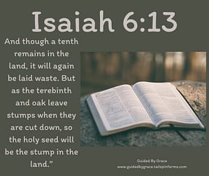 God encouraged Isaiah by telling him that a few faithful people would believe and respond to his message and be spared from the destruction that would come to those who would come to those who would resist. Through this new Judah, God would work out His plan of salvation for the world, bringing people of all nations back into a right relationship with God. Even today, when God judges a spiritually rebellious and ineffective church, God will preserve and work through those who remain faithful and holy – spiritually pure, separated from evil and dedicated to God and His Word.