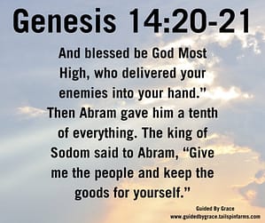 Out of gratitude for God’s help and grace, Abram gave Melchizedek, as priest, a tenth of what he had recovered from the battle (Hebrews 7:4). This is the first time tithing (giving a tenth) is mentioned in the Bible.