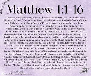 Matthew’s Gospel – his account of the “good news” and true story about Jesus Christ – opens with this list of Jesu’ Jewish ancestors. This Gospel traces Jesus’ family history through the paternal line (His earthly father’s side), as was Jewish custom (Matthew 1:16). Although Joseph was not Jesus’ biological father (Jesus was conceived by a miracle of the Holy Spirit, Matthew 1:20), he was his legal father. God had promised that the Messiah – the promised Savior who would be a blessing to the whole world – would be a descendant of Abraham (Genesis 12:3; Genesis 22:18; Galatians 3:16) and King David (2 Samuel 7:12-19; Jeremiah 23:5). By tracing Jesus’ legal ancestry back to these two men, Matthew shows the Jews that Jesus had the proper genealogy (family history) to qualify as the Messiah (Matthew 1:1). Look closely at some of the people in Jesus’ family line. Several in the list experienced some major failures in their lives (Judah, Rahab, Manasseh), yet they represent the broad range of people who put their faith in God and became part of His family. They also serve as examples of how God can work His highest purposes through anyone who totally submits to Him, no matter how ungodly their background or failures have been.