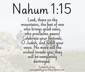 In the same way, New Testament preachers, missionaries and anyone who spreads the message about forgiveness and new life through faith in Christ are also bringing good news. In fact, this is the greatest news we could receive because it announces freedom from the bondage of sin and Satan’s power. It also provides the opportunity for peace and eternal life with God (Romans 10:15, which uses the image in this passage to make the pint about messengers of the gospel of Christ). At a time in the future that is determined by God, sickness and sorrow will be totally removed from the presence of God’s people, the ungodly world will be destroyed, and Satan will be thrown into the fiery lake for eternity (Revelation 19-21).