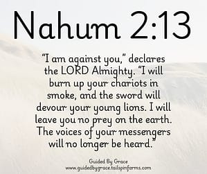 Behold, I am against thee, saith the Lord of hosts, and I will burn her chariots in the smoke, and the sword shall devour thy young lions: and I will cut off thy prey from the earth, and the voice of thy messengers shall no more be heard.