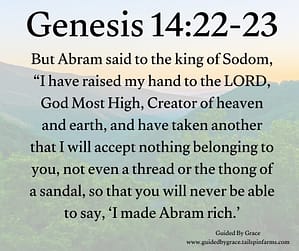 And Abram said to the king of Sodom, I have lift up mine hand unto the Lord, the most high God, the possessor of heaven and earth, 23 That I will not take from a thread even to a shoelatchet, and that I will not take any thing that is thine, lest thou shouldest say, I have made Abram rich: