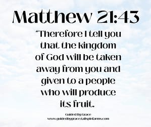 Israel rejected Jesus as their Messiah (the “Anointed one,” Savior, Christ), which revealed that they misunderstood Jesus’ purposes. The resisted in open rebellion against His plan of salvation. As a result, God’s kingdom and power are given to others – to those who respond positively to the message of Christ – whether they are Jew or Gentile (people from nations and cultures that are not Jewish, 1 Peter 2:9). This principle is still in operation. The kingdom and its power will be taken away from those who fail to remain faithful to Christ (Romans 11:19-22). Instead, it will be given to people who separate themselves from the ungodly beliefs and behaviors of the world and who pursue God’s standards and purposes above all else (Matthew 5:6; 6:33).