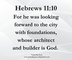 Abraham knew that the earthly promised land was not the end of his journey of faith. Rather, God’s promise pointed beyond everything on earth to the heavenly city that God has prepared for His faithful servants. Abraham serves as an example for all God’s people, reminding us that we are only traveling through this world on our way to God’s city and His home for us in heaven. We are not to look for unending security in this present life or be attached to this present world (Hebrews 11:14, 16: 13:14). We must consider ourselves as strangers and exiles on the earth. This is not our homeland; the end of our journey will be “a better country” (Hebrews 11:16), “the heavenly Jerusalem” (Hebrews 12:22) and the “city that is to come” (Hebrews 13:14).