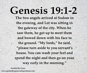 And there came two angels to Sodom at even; and Lot sat in the gate of Sodom: and Lot seeing them rose up to meet them; and he bowed himself with his face toward the ground; 2 And he said, Behold now, my lords, turn in, I pray you, into your servant’s house, and tarry all night, and wash your feet, and ye shall rise up early, and go on your ways. And they said, Nay; but we will abide in the street all night.