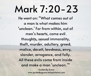 In this passage “makes … ‘unclean’” (Mark 7:20) means being spiritually corrupted in a way that separates a person from the life and purposes of God and ruins his or her relationship with Christ. Throughout God’s Word, the “heart” represents a person’s entire inner being, including the intellect, emotions, motives, desires and will. An impure heart will corrupt one’s thoughts, feelings, words and actions (Proverbs 4:23; Matthew 12:34; 15:19). Those who follow Christ must live in a way that reflects a heart that is new and transformed – different from what is natural in the world – a heart that is becoming more and more like Jesus (Luke 6:45).