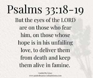 While the “eyes of the LORD” are on all people (Psalms 33:13-14), He watches over in a special way those who “fear Him” (Psalms 34:15) – those whose hearts are filled with awe and respect for His power and holiness (purity, completeness and separation from evil). God’s “eyes” refer to God’s loving care and oversight of our lives. “To deliver them from death and … famine” means that as long as we fear the Lord, put our hope in Him, wait patiently for Him to act and keep following His plans, God will watch over and protect us so that we will not die unless it is part of His plan.