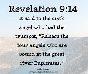 The sixth angel releases four angels. These must be evil angels or demons, since holy angels are not bound. They are let loose to kill one-third of the world’s population (Revelation 9:15). They are released from the river Euphrates, the longest river in western Asia (about 1,700 miles), which marked the boundary between Israel and her historic enemies to the east (Assyria and Babylon). In Old Testament history, the Euphrates area symbolized a military invasion by which God brings judgment (Isaiah 8:5-8; 10:5-7).