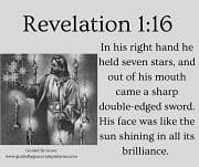And he had in his right hand seven stars: and out of his mouth went a sharp twoedged sword: and his countenance was as the sun shineth in his strength.