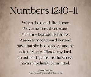 And the cloud departed from off the tabernacle; and, behold, Miriam became leprous, white as snow: and Aaron looked upon Miriam, and, behold, she was leprous. 11 And Aaron said unto Moses, Alas, my lord, I beseech thee, lay not the sin upon us, wherein we have done foolishly, and wherein we have sinned.