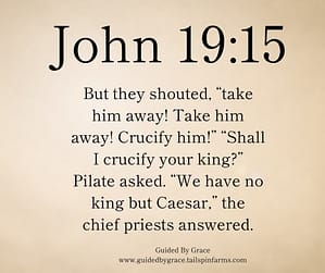 But they cried out, Away with him, away with him, crucify him. Pilate saith unto them, Shall I crucify your King? The chief priests answered, We have no king but Caesar.