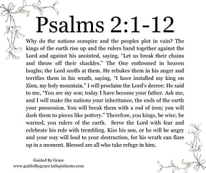Why do the heathen rage, and the people imagine a vain thing? 2 The kings of the earth set themselves, and the rulers take counsel together, against the Lord, and against his anointed, saying, 3 Let us break their bands asunder, and cast away their cords from us. 4 He that sitteth in the heavens shall laugh: the Lord shall have them in derision. 5 Then shall he speak unto them in his wrath, and vex them in his sore displeasure. 6 Yet have I set my king upon my holy hill of Zion. 7 I will declare the decree: the Lord hath said unto me, Thou art my Son; this day have I begotten thee. 8 Ask of me, and I shall give thee the heathen for thine inheritance, and the uttermost parts of the earth for thy possession. 9 Thou shalt break them with a rod of iron; thou shalt dash them in pieces like a potter’s vessel. 10 Be wise now therefore, O ye kings: be instructed, ye judges of the earth. 11 Serve the Lord with fear, and rejoice with trembling. 12 Kiss the Son, lest he be angry, and ye perish from the way, when his wrath is kindled but a little. Blessed are all they that put their trust in him.